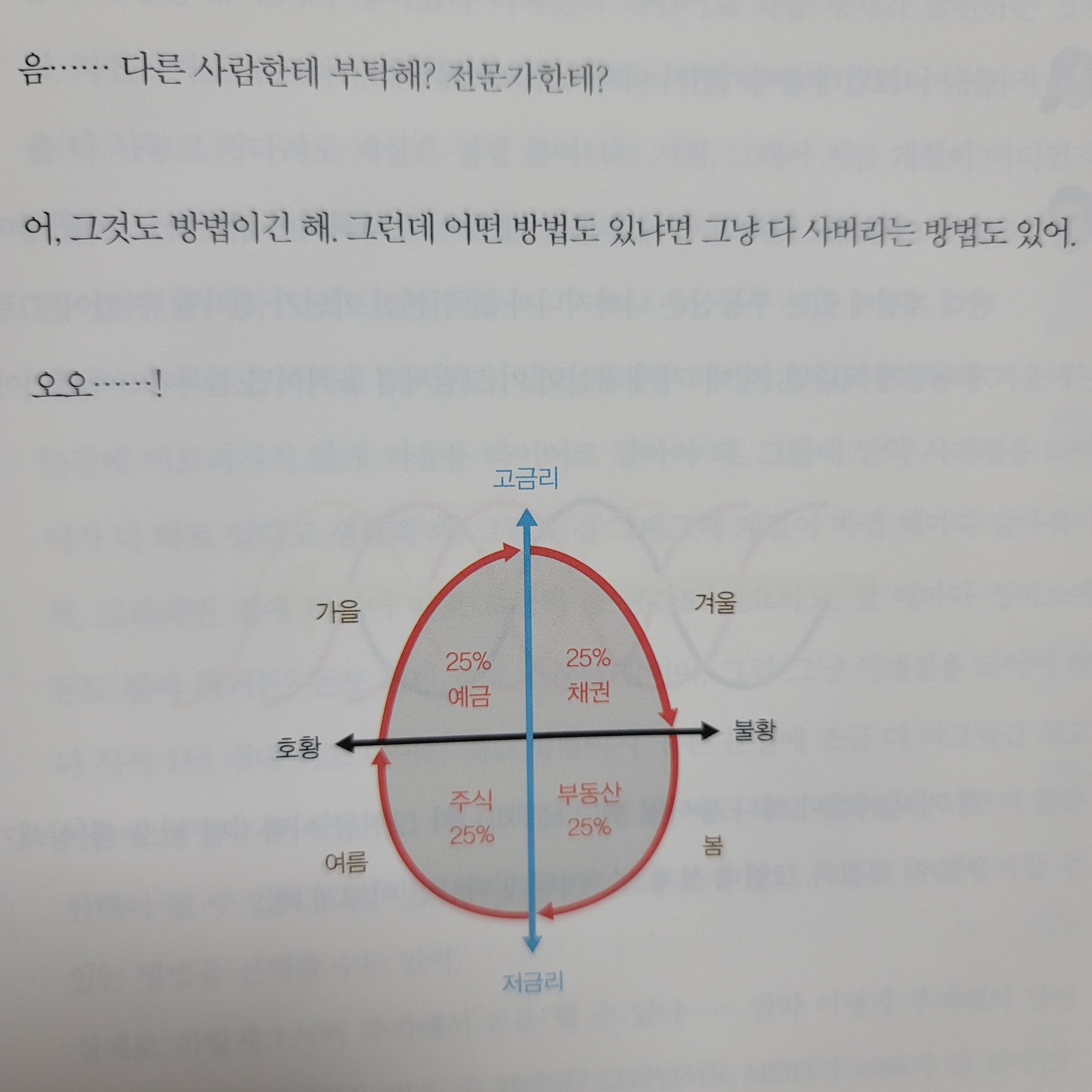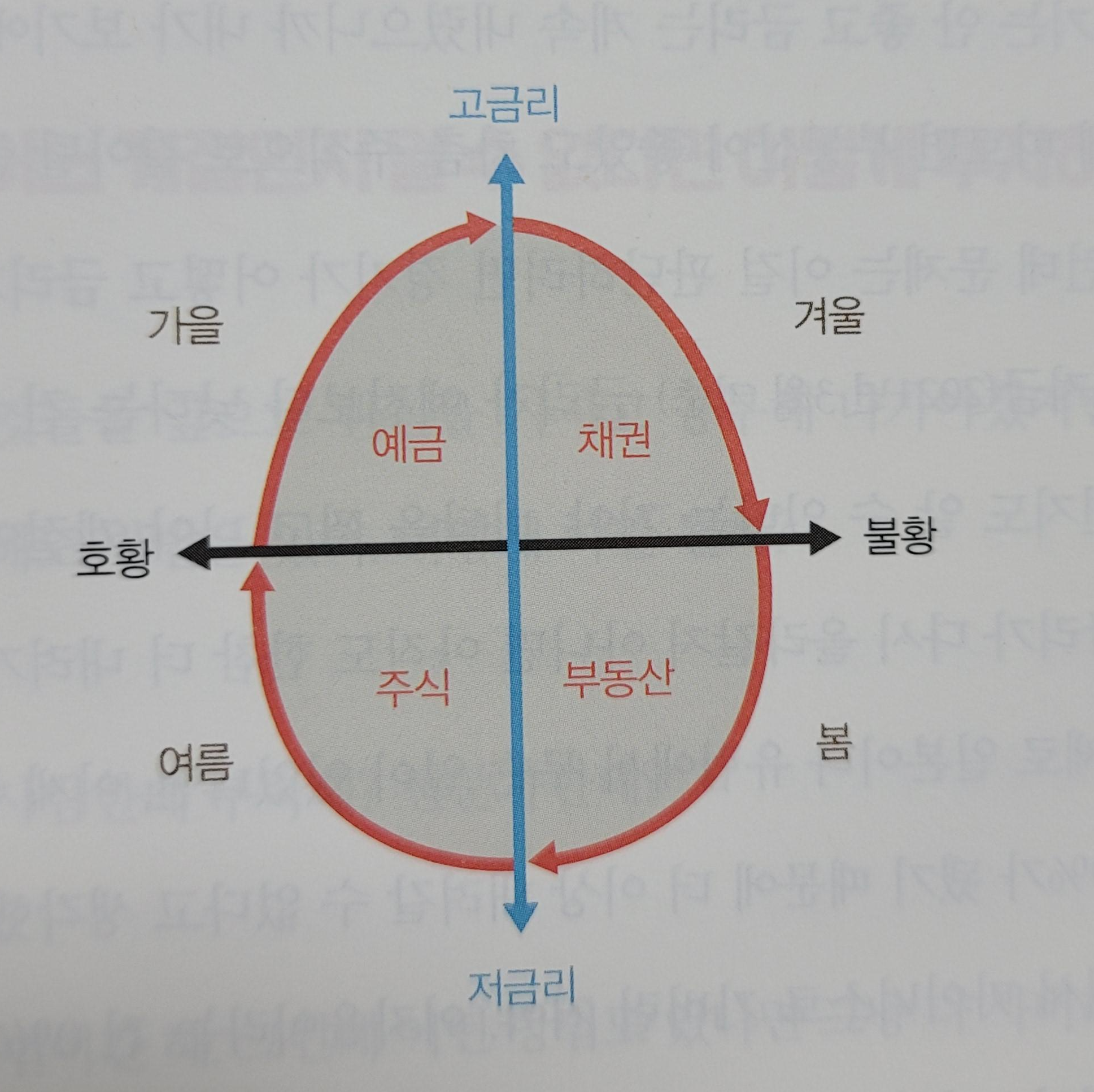 * (당연히 이렇게 딱 나눌 순 없지만 정리하자면)( 코스톨라니의 달걀에 의하면 금리도 떨어지고 경기도 안 좋을 때는 채권 투자가 좋다. 경기는 바닥에서 올라가기 시작했고 금리는 아직 낮을 때는 이자가 싸니까 대출해서 부동산이 좋다. 금리가 바닥 찍었다가 다시 오르고, 경기는 가장 좋아질 때는 주식. 경기는 나빠지는데 금리는 계속 오른다면 예금.