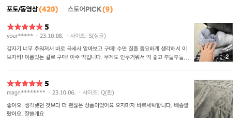 역시 이브자리 이불이라는 후기가 많았으며 생각보다 얇았다는 후기도 있었습니다. 사람마다 생각하고 구매하는 겨울 이불 두께가 다르기 때문에 정확히 살펴보고 구매하는 것이 좋을 것 같습니다.