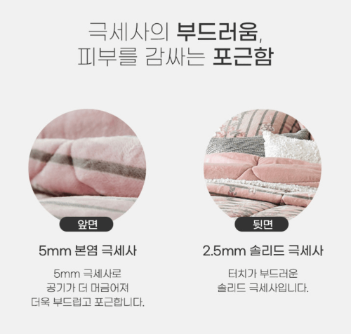 앞면과 뒷면 모두 부드러운 극세사로 이루어져있어서 정말 따뜻하고 차가운 공기를 잘 차단한다고 합니다. 또한 양면이 극세사이기 때문에 기호에 따라 앞 뒷면을 번갈아 가면서 사용할 수 있는 것도 장점입니다.